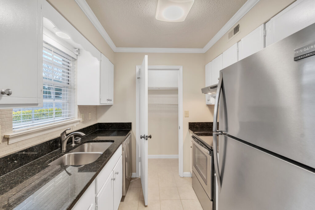 A first-floor unit, 183 Riverbend was purchased in 1995 and was the first we bought of the “Phase II” units, which was the second stage of construction when Riverbend was first built as an apartment complex. The unit has been fully updated with granite countertops and stainless appliances in the kitchen; the kitchen, bath, and screened in porch have ceramic tile floors. Most of the rest of the condo is floored with a synthetic plank that looks and feels like wood flooring; only the bedroom and walk in closet are carpeted.
